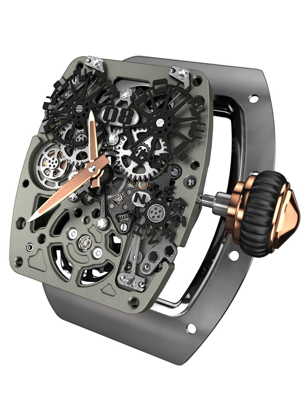 RM 037的独特之处还在于其丰富的细节,例如采用可变几何结构的摆陀和无卡度游丝摆轮,以及在整个机芯中广泛使用的花键螺丝。RM 037腕表在12点钟位置设有超大日期显示,同时配备了一枚功能选择器,通过简单按压就能随意切换上链(W)、空挡(N)和指针设置(H)等功能。位于4点钟位置的窗口则显示当前所选功能。通过其特殊的齿轮传动系统可有效减小施加在表冠上的压力,同时表冠的功能也不会对机芯造成任何干扰。