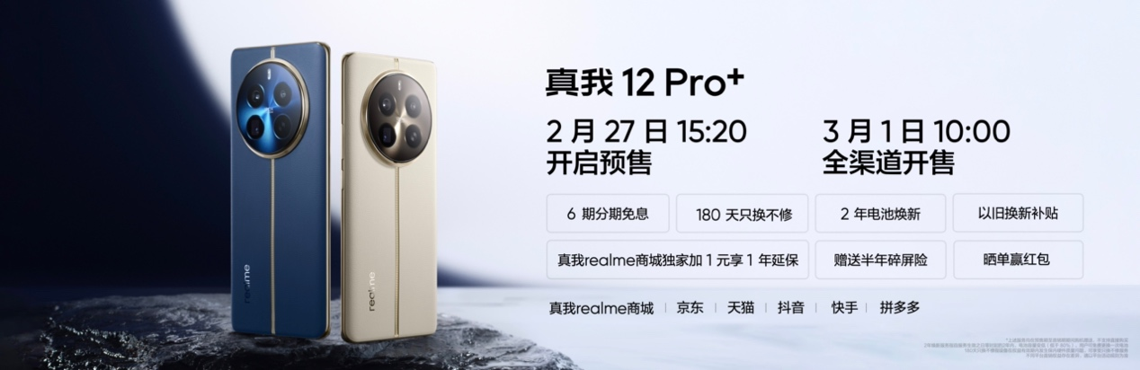 真我12 Pro+将于2月27日15:20开启预售,3月1日10:00全渠道正式开售,真我12 Pro将于2月27日15:20在京东独家开售,参与真我12 Pro系列首销的用户,可享6期免息分期、180天只换不修、2年电池焕新等多项超值福利。