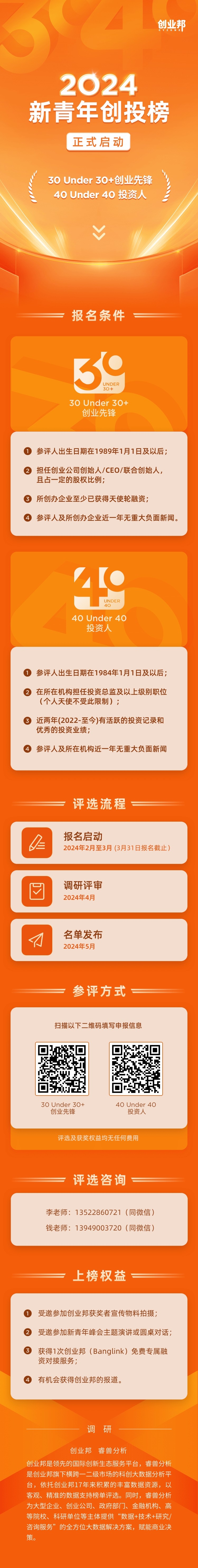 创业邦持续关注创投圈青年新势力,今年正式启动2024年度“35岁以下创业先锋”和“40岁以下投资人”评选活动。