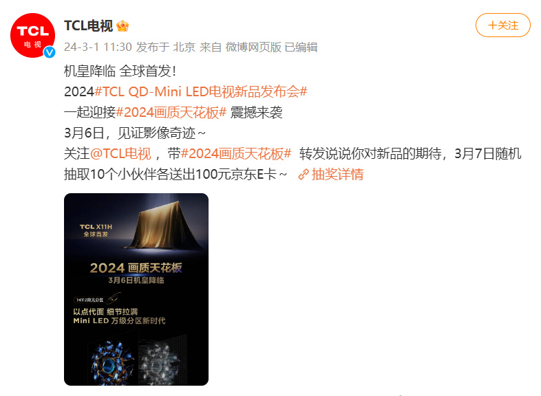 TCL电视日前正式公布,将在3月6日举办TCL QD-Mini LED电视新品发布会,届时将向全球观众首发其全新旗舰产品——TCL X11H。