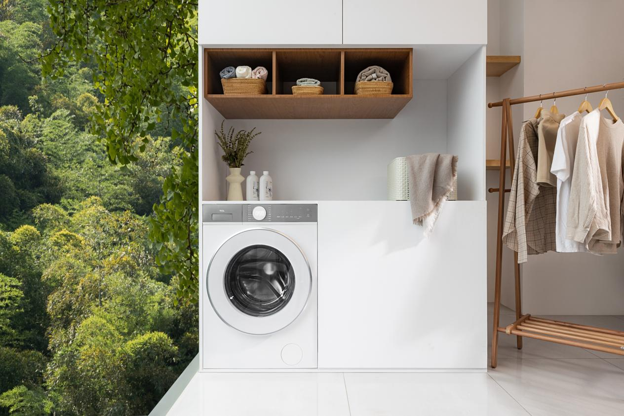 性能强劲、功能多样的TCL超级筒洗衣机,尺寸却小得出乎意料,12kg版本侧面深度仅570mm,而普通滚筒洗衣机一般在630mm以上,也就是说,这款新品深度减少了11%,可以完美嵌入深度600mm的主流家装柜体,机身和柜体表面纯平一体,毫无多余和凸出。充足的预留空间,也避免了为水管电线砸墙掏洞的麻烦,更加美观且装修成本更低。
