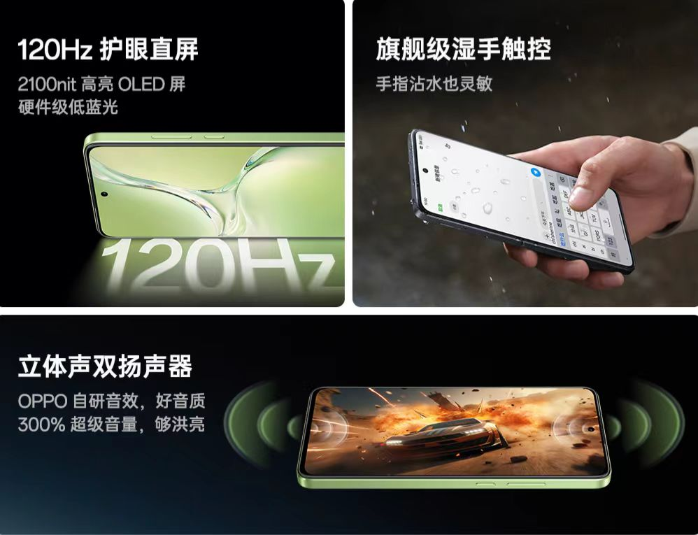 屏幕方面OPPO K12x采用6.67英寸OLED高刷护眼直屏,屏幕局部峰值亮度高达 2100nit,全局亮度高达 1200nit,即便是在户外强光下依旧清晰可见。同时,它也支持硬件级低蓝光,有效减少屏幕有害蓝光,无论明暗,都呵护双眼。此外,OPPO K12x支持同档罕见的湿手触控,哪怕是雨天手机屏幕意外沾水,或手指沾水,滑动屏幕也流畅灵敏,使用更便捷。OPPO K12x还拥有立体声双扬声器及300%超级音量,高音响亮不破音,电话、导航、听歌、追剧、玩游戏等声音更清晰。自带3.5mm耳机孔,轻松连接有线耳机。影像方面OPPO K12x后置5000万超清主摄,1600万像素前置摄像头,随时随地拍出超清质感好照片。