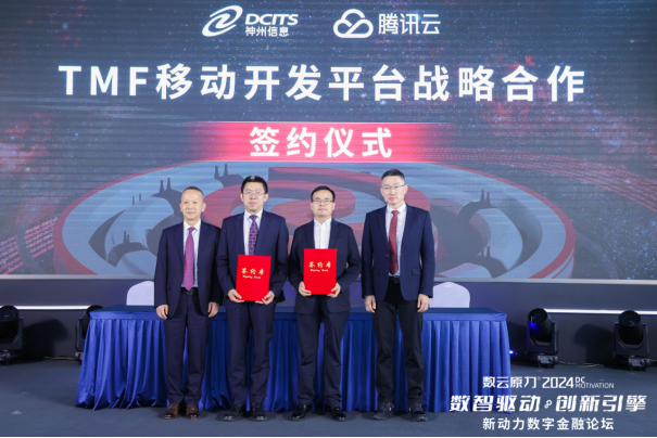 现场还举行了两场签约仪式。在神州信息与腾讯云“TMF 移动开发平台战略合作签约”仪式上,神州信息常务副总裁于宏志、腾讯云副总裁胡利明代表双方签署协议,神州信息总裁李鸿春、腾讯云总裁邱跃鹏共同见证签约。本次签约后,神州信息成为腾讯云TMF金融领域独家授权伙伴,可借助TMF平台功能进行定制化开发,满足客户需求,弥补移动开发短板。