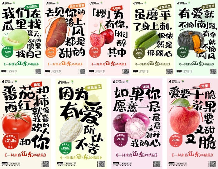 展览优选了来自山东本地的应季新鲜水果蔬菜,配合走心又走胃的“表白”,向用户展示了时令鲜果的独特优势:聊城玉菇甜瓜有像冰激凌般的甜美口感、济宁的洋葱能像水果一样吃……创意情蔬不仅展现了果蔬的核心卖点,让人们对山东各地的果蔬有了更深刻的认知,同时,拟人化的趣味文案也吸引了大量用户的参与,让这场别出心裁的“情蔬”展实现破圈传播,大量用户在现场打卡拍照留念、晒朋友圈分享。