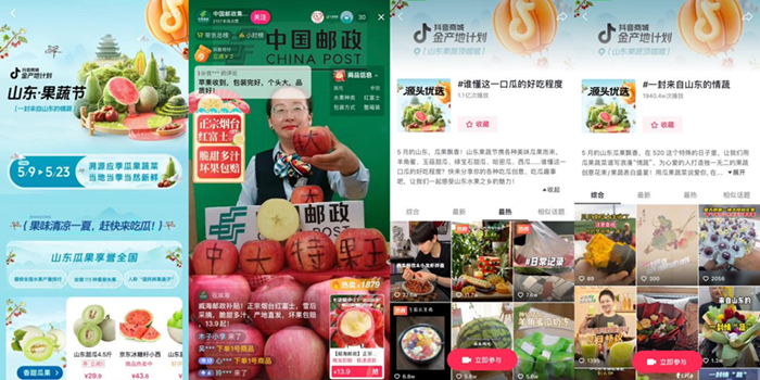 #谁懂这一口瓜的好吃程度、#一封来自山东的情蔬 等线上话题引发了众多商家、产地达人、地方文旅参与。在话题中,消费者被科普各种果蔬的品种差异避免踩坑,还能跳转至抖音商城直接购买到来自源头产地、实惠又好吃的新鲜果蔬。