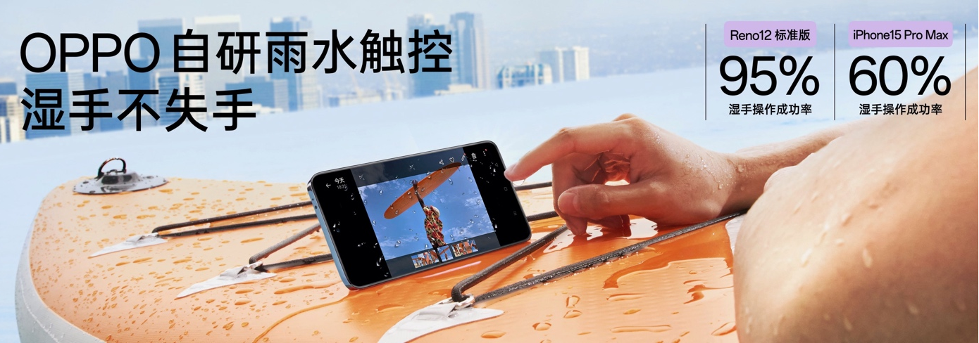 雨水触控功能专为湿手、汗手等典型游戏场景下的触控失灵而优化,在屏幕溅水、手粘汗水、屏幕凝结水汽等状况下,Reno12 系列都可实现高精度、高成功率的触控。配合 IP65 防尘防喷淋认证,Reno12 系列可随时随地,放心开玩。