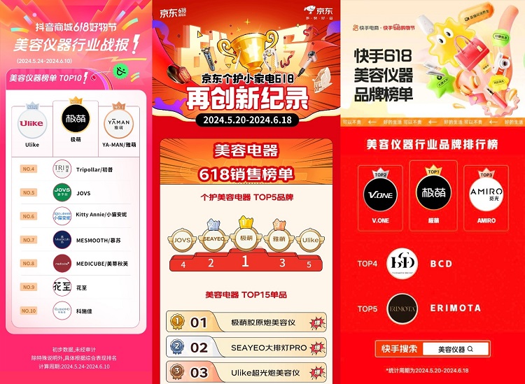 在射频美容仪时代,极萌已经凭借其高品质和有效性成为行业标杆,在多次大型电商活动中荣获冠军,更是在今年行业新规实施后的首次618中,再次以无可争议的实力夺得了Top 1的宝座。这不仅证明了Jmoon极萌品牌在家用美容仪领域的强大竞争力,也彰显了其在推动行业发展和创新方面的引领作用。