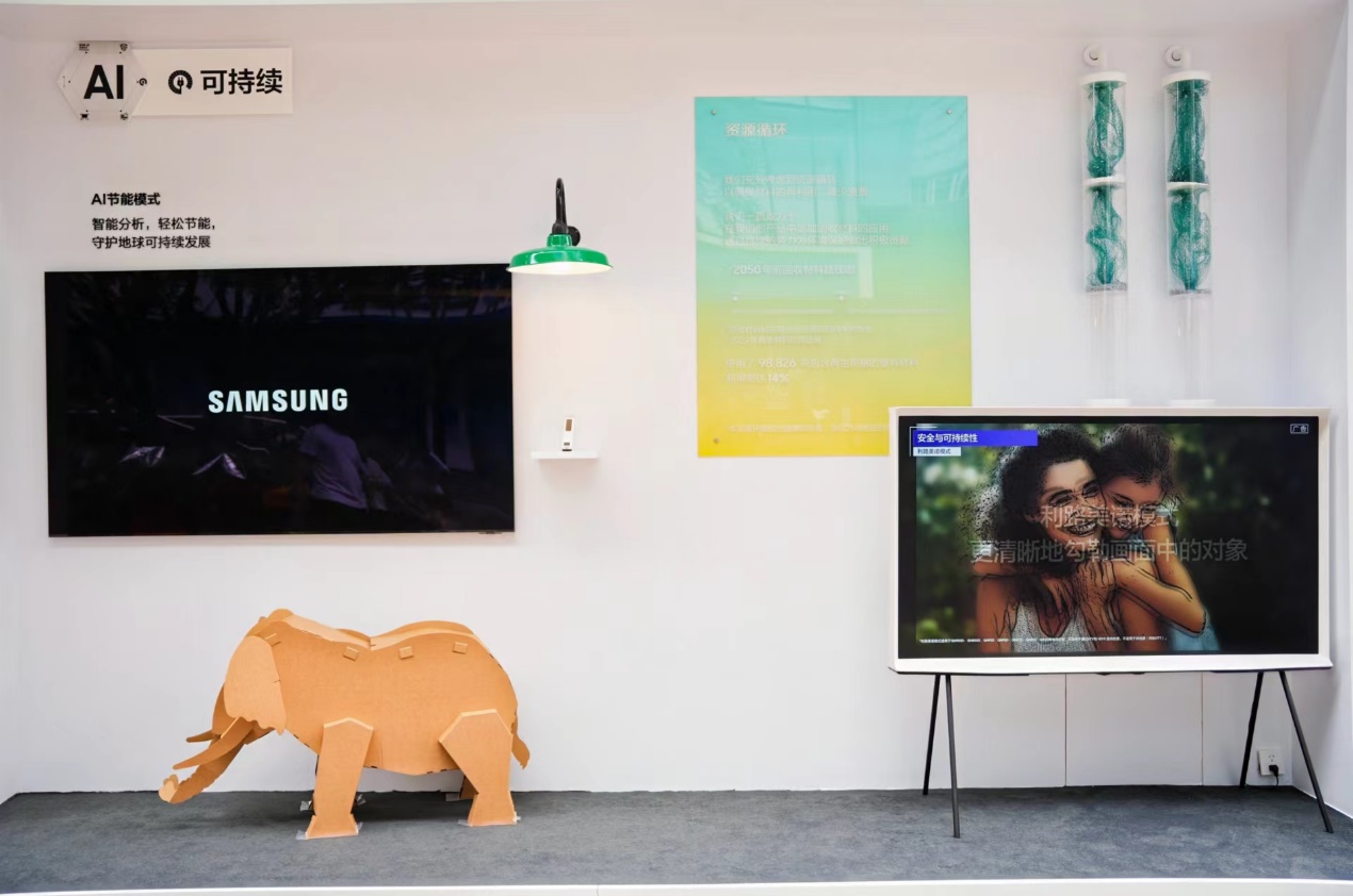 在可持续体验区,SmartThings 搭载的AI 节能模式,为用户打造了智慧与环保并重的居家娱乐新体验。通过智能分析,自动检测周遭的光线水平并且分析使用行为进行亮度调节,还能逐个场景分析电视内容,尽可能巧妙地调整亮度,减少整体能耗。三星电视标配的太阳能遥控器可以通过太阳能板材吸收自然能源补充电量,不再需要一次性电池,将守护地球可持续发展落到实处。