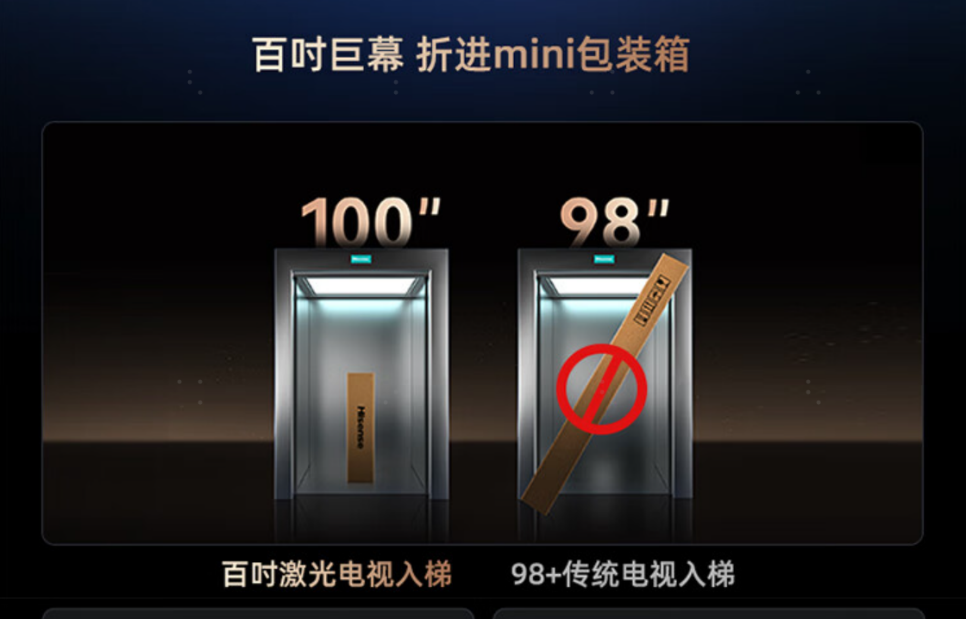 而针对目前很多用户面临的百吋电视入户难问题,海信更是首创“可折叠”屏幕解决方案,让超百吋大屏可以轻松入户。