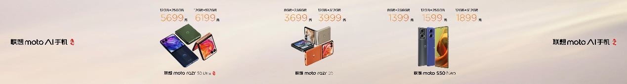 本次发布会发布的新品中,联想moto razr 50 系列于6月25日15点30分,于联想官网、智生活门店及各大电商平台现货开售。其中,备受关注的全新折叠屏联想moto razr 50 Ultra AI元启版售价为5699元(12GB+256GB)和6199元(12GB+512GB);联想moto razr 50的售价为3699元(8GB+256GB)和3999元(12GB+512GB);而联想moto S50 Neo有三个售价,分别是1399元(8GB+256GB)、1599元(12GB+256GB)和1899元(12GB+512GB)。新品首发,福利优厚。首发期参与预售或购买联想moto razr 50系列的用户,可享12期分期免息权益,还支持以旧换新至高补贴1000元,moto老用户将额外再补贴200元。而购买联想moto S50 Neo的用户,除了可享4年质保外,首发期参与预售或购买的用户还支持以旧换新至高补贴500元,moto老用户将额外再补贴100元。在京东自营购买的用户更可享30天无忧换。