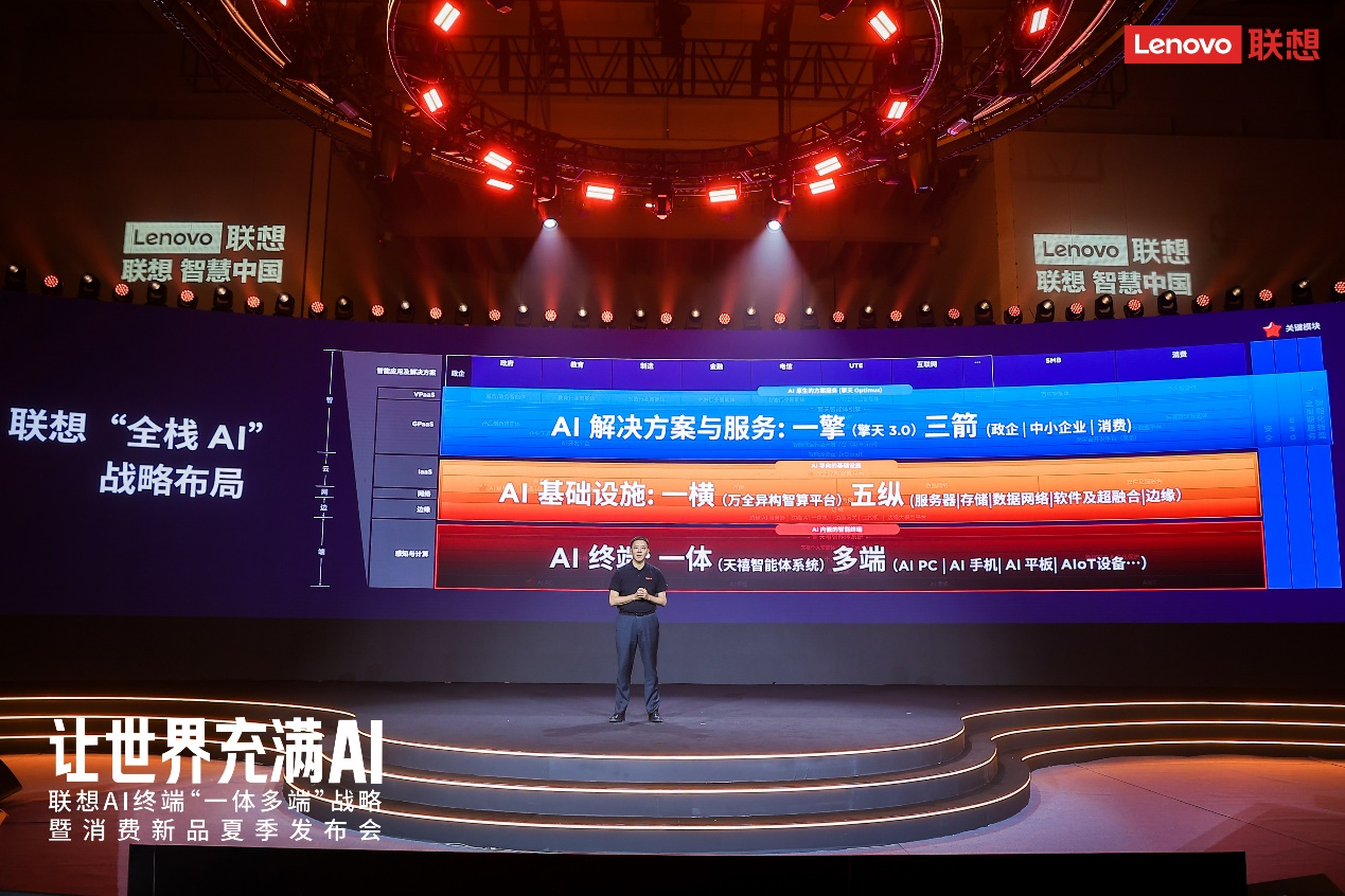 “‘一体多端’战略和发展理念,目标只有一个,那就是让用户在工作、学习和生活的不同场景下,都能获得‘个人AI助理’新体验。”除了在以“一体多端”战略领跑AI PC、AI手机、AI平板和AIoT等“AI内嵌的智能终端”外,联想还在“AI导向的基础设施”和“AI原生的方案服务”领域取得了明显突破,三者共同推进着联想的“全栈AI”战略布局。