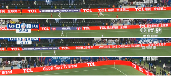 TCL作为2024美洲杯的官方合作伙伴,在比赛当日,可以看到赛场边的LED广告牌上的“TCL电视 全球第二”和“…