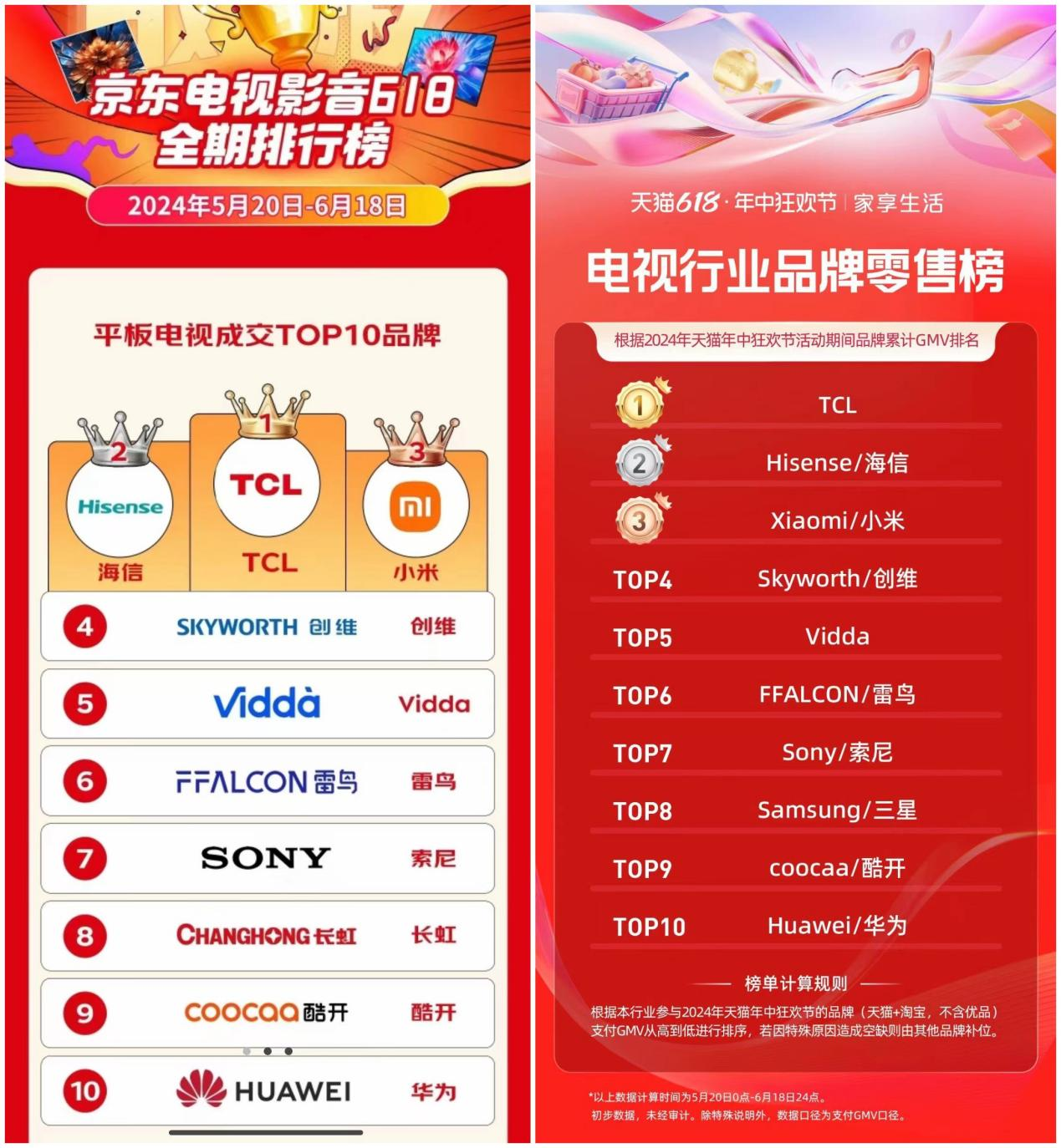 值得一提的是,在今年的618购物节期间,TCL电视以其出色的性能和品质,展现出了卓越的竞争力。在京东电视影音618全期排行榜中,TCL电视成功跻身成交排名榜首。同时,在天猫618电视行业品牌要售榜上,TCL更是凭借最高的支付GMV脱颖而出,荣获排名TOP1的荣誉。这一系列优异表现不仅凸显了TCL品牌的强大实力,也彰显其在消费者心中的首选地位。