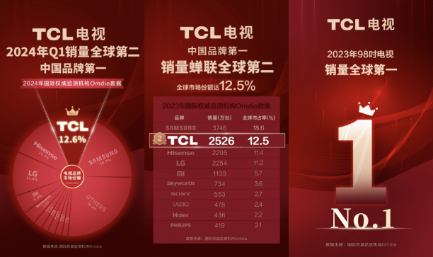 TCL的巨屏领域硕果累累,因此它在2023年98吋电视这样的高端大屏市场销量全球第一,同时TCL电视全产品线表现优秀,在2023全年以及2024年Q1季度蝉联全球第二,剑指全球第一。