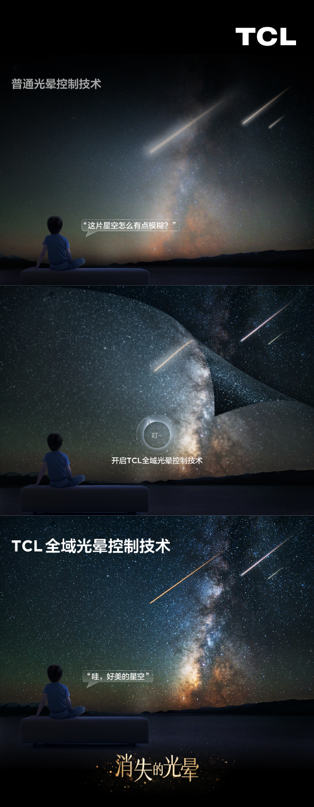 TCL为了解决该问题,在X11H上首发TCL全域光晕控制技术,综合了六晶方芯Ⅱ、超聚光微透镜、行业最小微距OD、背光控制算法和A++蝶翼星曜屏的控光设计,在画面成像的全链路上终结了光晕,让电视上的星空和电影特效更加清晰和有层次感。