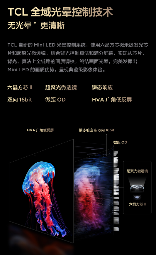 就拿最近火爆的Q10K Pro Mini LED电视来说,TCL全域光晕控制技术包含了六晶方芯II、超聚光微透镜、背光响应算法、微距OD值和HVA广角低反屏。