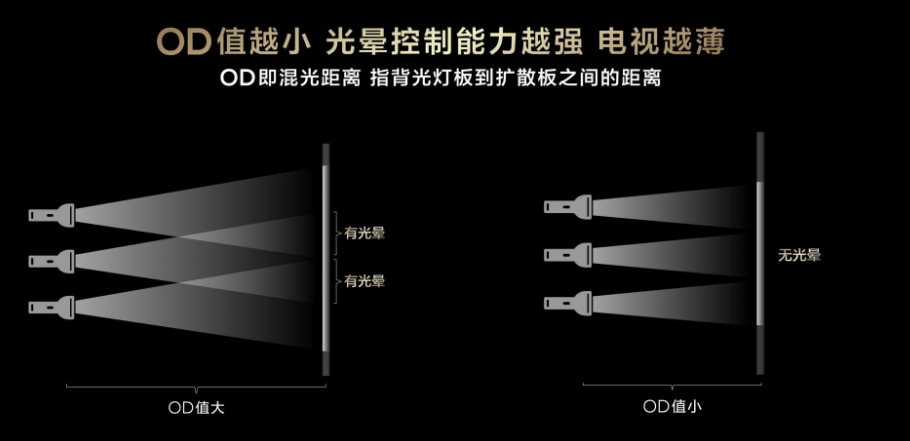 其中,超聚光微透镜与微距OD值,在光晕控制上起到了重要作用。超聚光微透镜是TCL透镜技术中的突破,可以让背光更均匀,同时收束光线,让光线集中在对应的分区内。而OD值指的是背光灯板到扩散板的距离,类似手电筒照射墙壁,距离越近,光线越集中,光斑越小,光晕也就能更好的被控制。