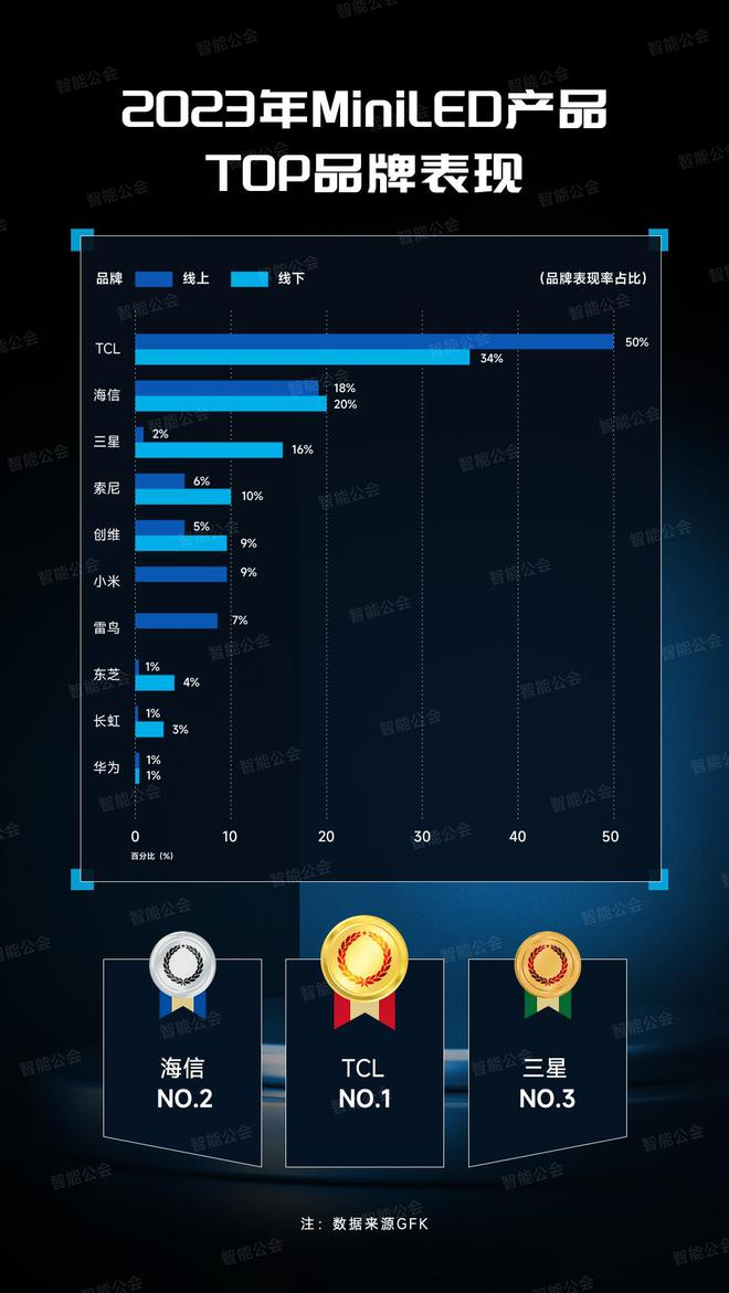 这个技术的出现,做到了软硬件相结合,解决了行业长期存在的光晕难题,让Mini LED电视的画质更进一步。而更出色完善的Mini LED技术,也让TCL在Mini LED产品TOP品牌表现排行榜中,稳坐TOP1。