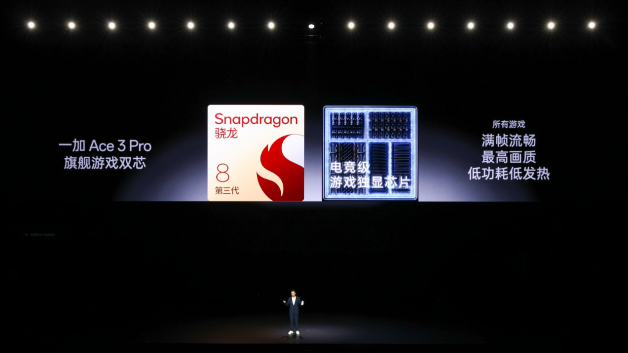 2024 年,OPPO 正式成立了游戏中心,这是和影像中心、AI 中心平行的三大核心研发部门。在游戏中心的加持下,此次一加 Ace 3 Pro 带来了一加有史以来最强的游戏体验。一加 Ace 3 Pro 搭载高通迄今最强的第三代骁龙 8 移动平台,搭配独家定制的电竞级游戏独显芯片,组成旗舰双芯组合。两颗芯片共同发力,一加 Ace 3 Pro 可以实现所有游戏满帧、高画质的运行。
