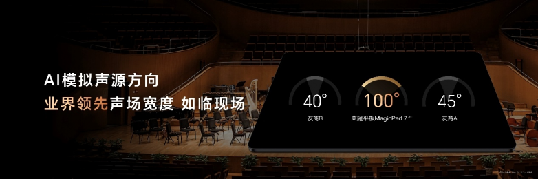 优秀的音频表现是荣耀平板MagicPad2的另一大看点。其搭载的超感知空间音频技术,为用户提供了卓越的听觉体验。该技术由空间重构和音质均衡两大自研核心支撑,通过高度渲染和混响模拟,构建出逼真的3D音频空间。同时,虚拟低音、动态控制和人声增强等技术确保音质纯净且不失真。