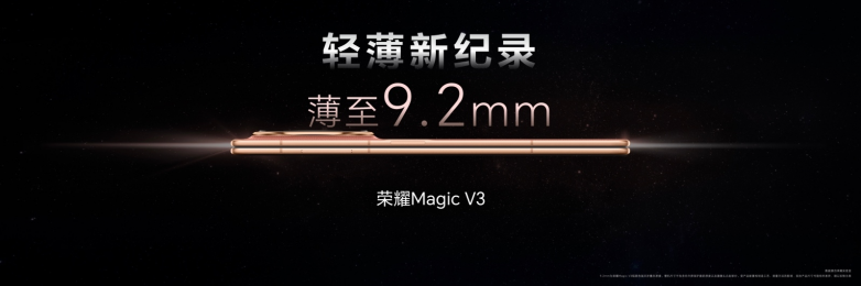 荣耀首款折叠屏荣耀Magic V,以闭合态14.3mm的机身在发布时即成为同期最薄折叠屏产品;荣耀Magic Vs采用全新自研“鲁班零齿轮铰链”及多种航天级轻质材料成为年度最轻折叠屏;荣耀Magic V2系列以薄至9.9mm的机身,引领内折大屏手机首次进入“毫米级”时代,实现折叠屏比直板机更薄。轻薄纪录至今12个月仍未被打破,成为智能手机史上划时代的重大颠覆性创新,推动折叠屏产品在智能手机市场占比稳步提升。距荣耀Magic V2发布一周年后的今天,荣耀Magic V3再次跨代领先,以9.2mm机身刷新毫米级时代轻薄纪录,进一步挑战折叠屏轻薄上限,实现轻薄折叠屏的再次突破与引领。