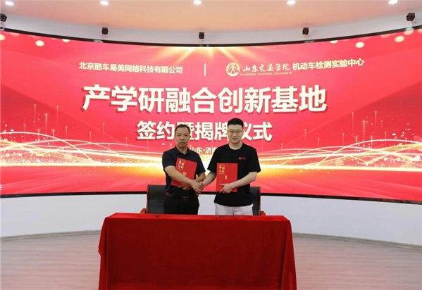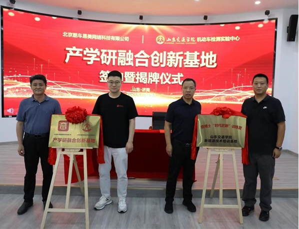 在签约仪式现场,查博士副总裁孙强、山东交通学院资产经营公司党委书记、董事长李西田共同为新能源产学研融合创新基地揭牌。查博士新能源事业部校企合作经理赵晨曦、山东交通学院检测实验中心主任山云霄共同为“时代匠新”新能源人才培训基地揭牌。