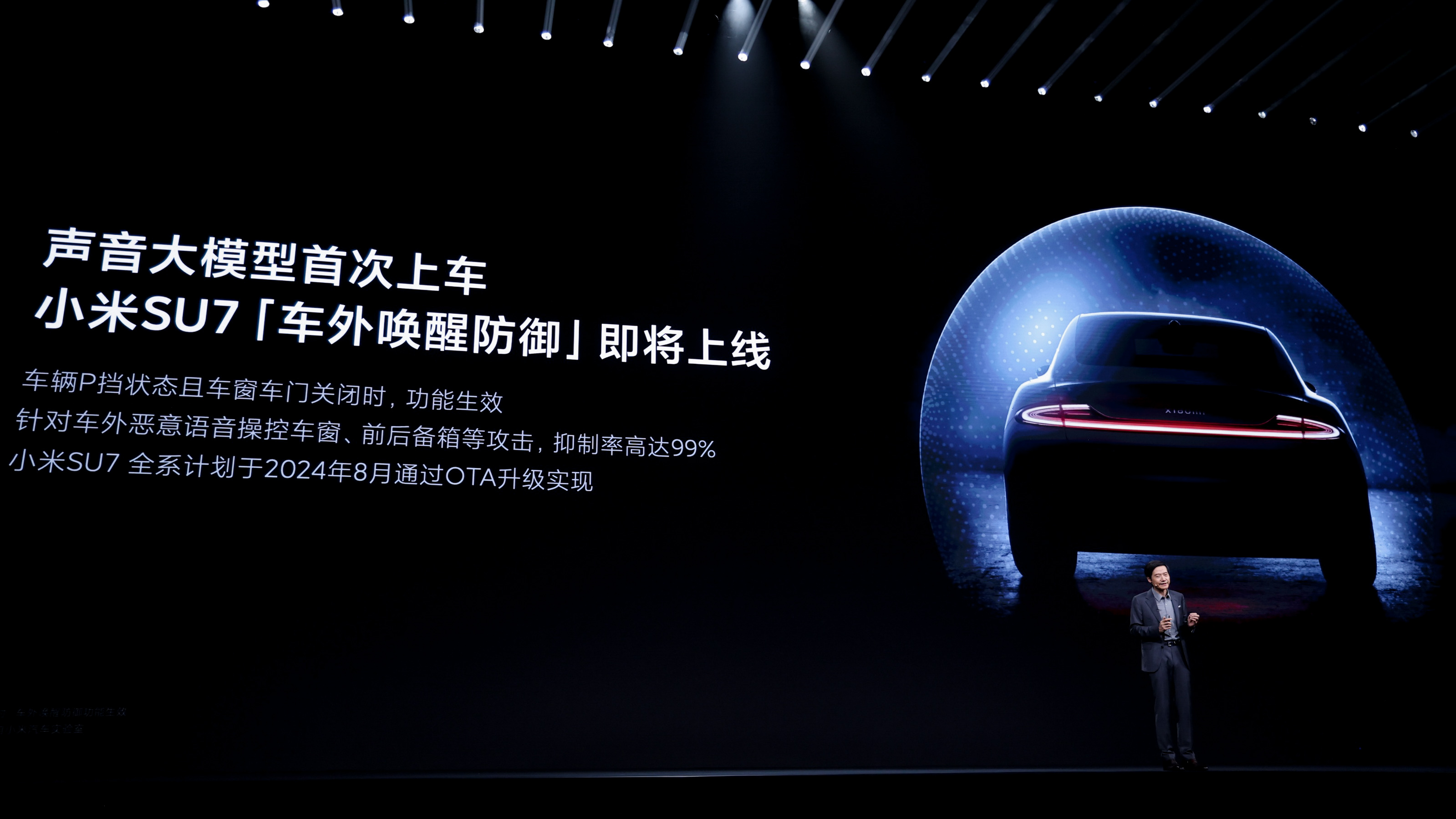 发布会上,小米自研的声音大模型首次亮相,它能实时识别自然界和生活中的各种声音,如婴儿哭声、水滴声,还能理解这些声音背后所处的环境和所表达的情绪。其中,声音大模型将应用到小米SU7上,带来创新的「车外唤醒防御」功能,它能够识别发声环境,无视车外的语音指令,让语音控车更安全,7月底将陆续升级。