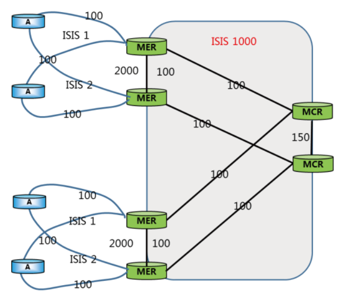 MCR根据双平面设计原则,汇聚环MER之间以及MER-MCR之间COST 设置一致均为100。同时为保证横穿流量尽量靠近接入层,相同层级节点之间互联电路COST值逐级减小,MCR-MCR之间COST设置为150大于MER-MER的COST值100。