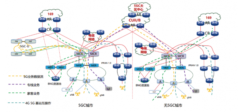 其中,核心设备(MCR)用于网内不同汇聚设备间流量转发以及与其他网络间流量转发;汇聚设备(MER)用于多业务综合承载接入,包括基站回传业务、大客户业务、通信云业务以及vBRAS业务等,与MER同局址的BBU或少量周边基站直接接入MER;接入设备(MAR)用于基站接入以及部分节点的综合业务接入。MCR和169网CR对接,疏导vBRAS家宽业务流量以及互联网专线类流量;MCR和CUII/B对接,疏导访问大区5GC流量;MCR和UPF对接,疏导访问UPF流量。MCR和IPRAN对接,疏导互通流量和访问4G 核心网流量;MCR 和电信网络对接,疏导共建共享流量。