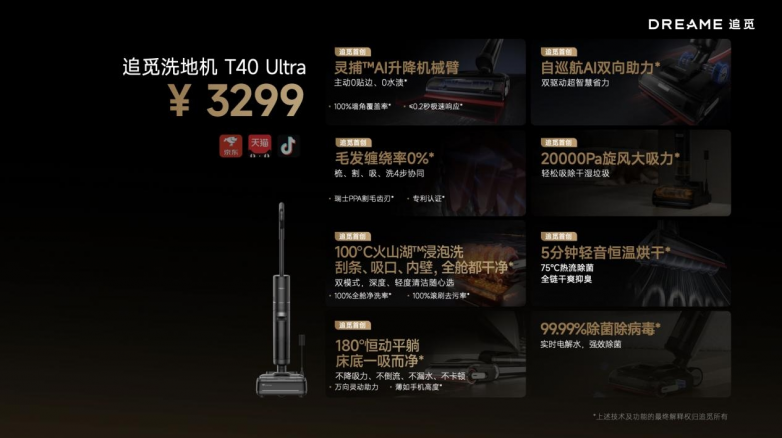 9月25日,以“去前面没有人的地方”为主题的追觅科技2024秋季全品类新品发布会在上海举行,在本次发布会上,追觅科技重磅发布了最新款洗地机产品T40 Ultra,该产品搭载两项全新行业首创技术——灵捕智能升降机械臂技术、100℃火山湖浸泡洗技术,再次引领行业技术产品创新,为用户带来前所未有的极致清洁体验。