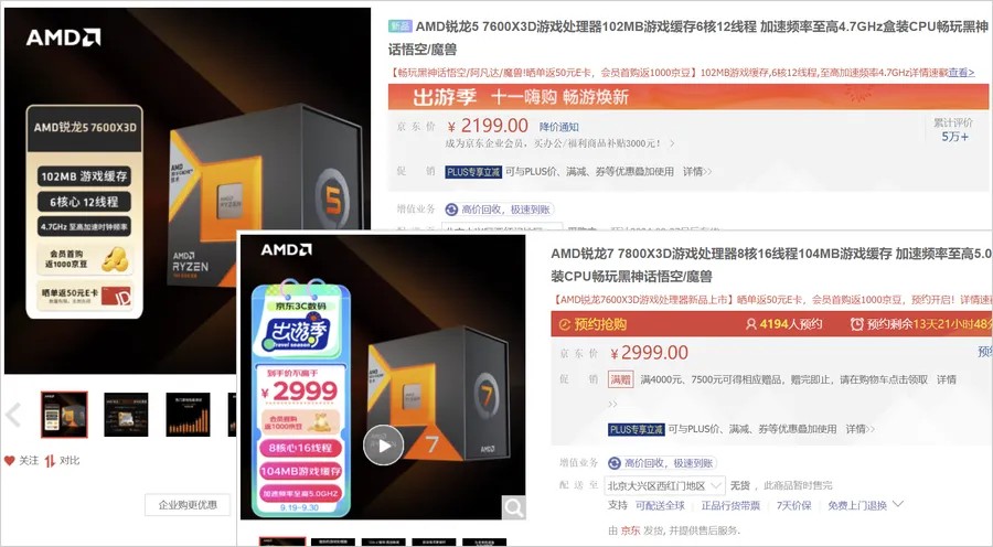 AMD锐龙7 7800X3D国行原盒目前售价2999元,这个价格目前还不一定能够买得到。很多第三方店铺,出价都要高于2999元。