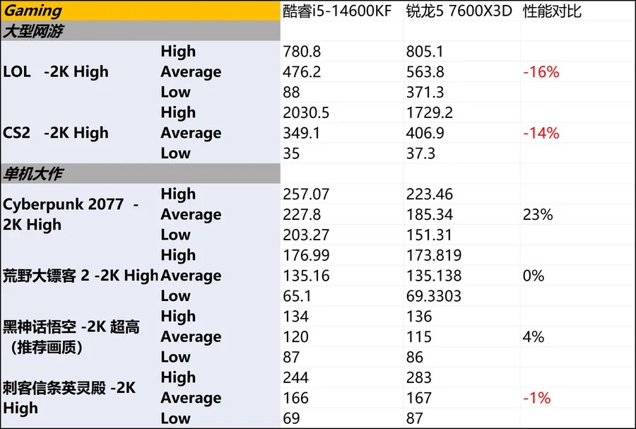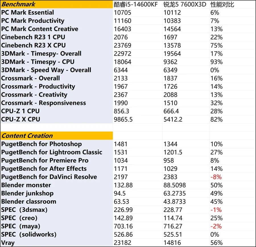 对于更看重生产力的用户,酷睿i5-14600KF大优于锐龙5 7600X3D。