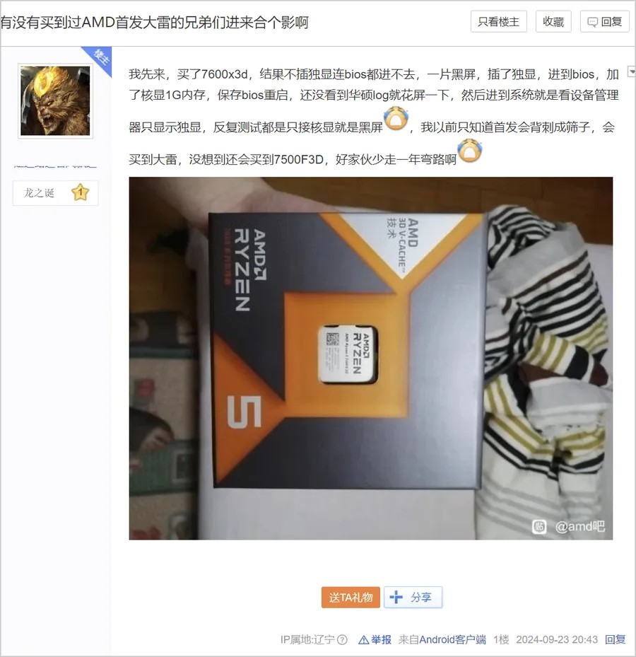 例如百度贴吧amd吧这位锐龙5 7600X3D处理器的用户,于2024年9月23日发帖求助,反应新攒的电脑黑屏。