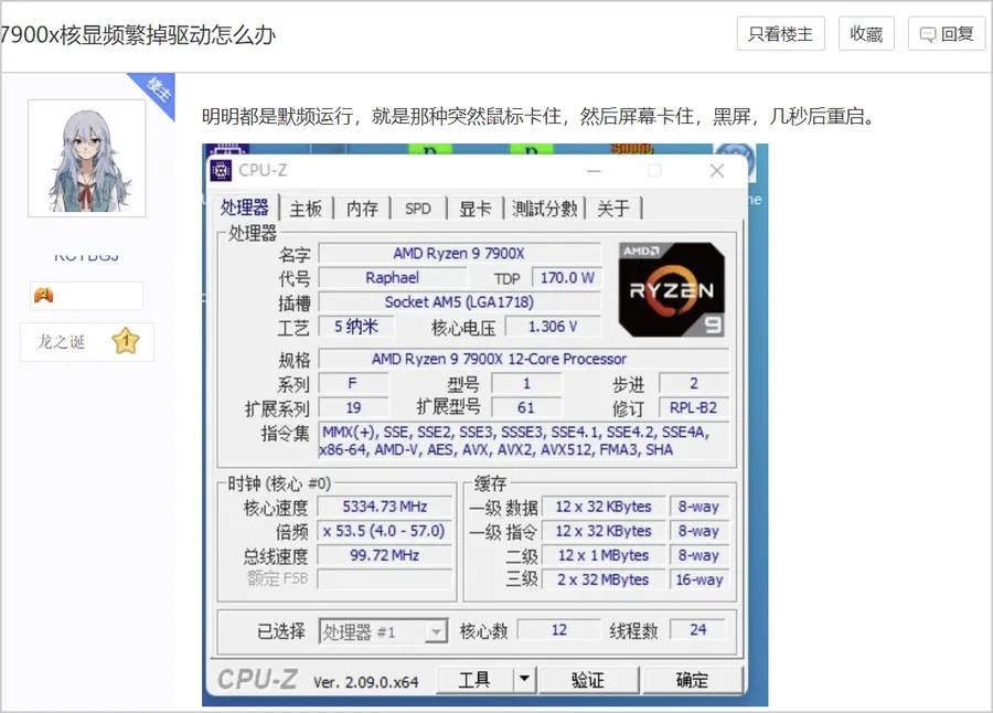 例如百度贴吧amd吧这位锐龙9 7900X处理器的用户,于2024年6月13日发帖求助,反应AMD处理器内置的集成显卡,频繁掉驱动。