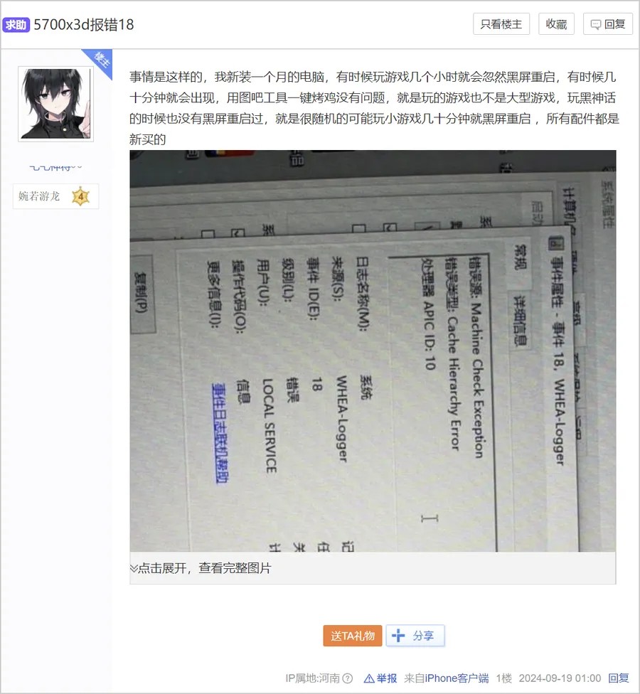 例如百度贴吧amd吧这位锐龙7 5700X3D处理器的用户,于2024年9月19日发帖求助,反应电脑黑屏。