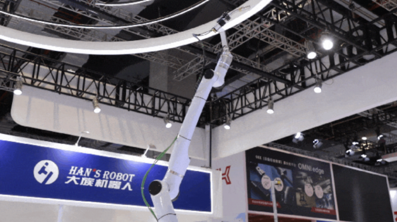 臂展1800mm的协作型焊接机器人:如前所述,E12协作机器人是大族机器人今年发布的全新产品之一,它可以应用在喷涂、焊接等不同领域。现场重点展示了它在焊接领域的高效应用——凭借1800mm的长臂展优势,这款可在没有升降柱、地轨等外设的情况下,轻松触达工件的每一个角落,完美完成焊接作业,支持激光焊、弧焊、保焊等焊接场景。