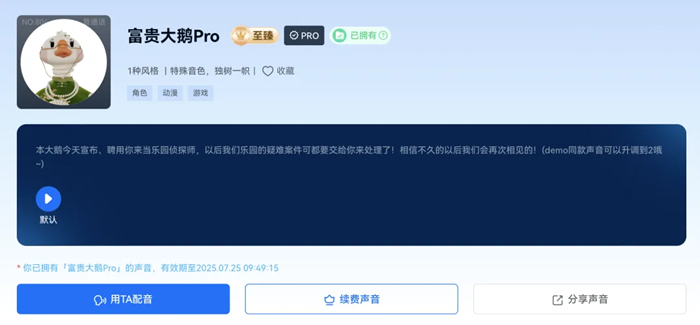 而为了能够让墩墩和大鹅更加生动,赋予他们特色的声音也是必不可少的一部分。「魔音工坊」是一款全球领先的集文案、配音、剪辑全流程一站式AI软件,海内外拥有超过800万注册会员,付费会员超60万。魔音工坊拥有千款AI音色,全方言多语种,百变风格适合各类视频创作及配音场景的声音商店(“墩墩”与“大鹅”的IP声音已在声音商店上线)。此外,「魔音工坊」还具有独创的精准调音平台“声音的word编辑器”,以及含声音搜索,声音克隆、生成式TTS“捏声音”等多种创造方式。在此基础上,「魔音工坊」还加入了超写实语音合成技术,可一键打造个性化语音。