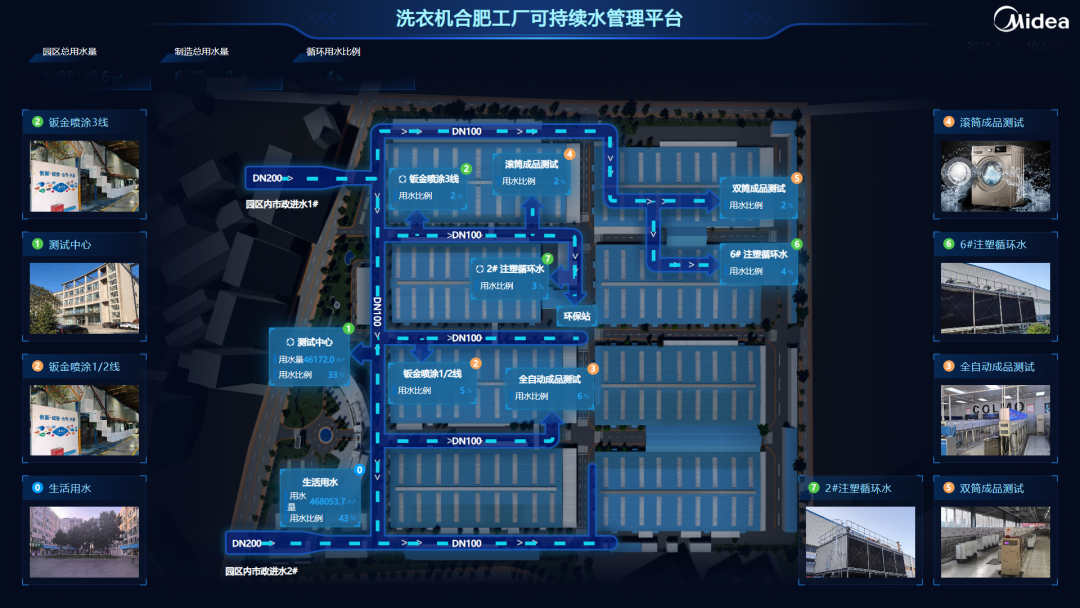 生产制造企业是用水大户,能否做好水资源管理是衡量工厂是否达到可持续发展的关键指标。美的洗衣机合肥工厂率先上线智能水孪生系统,工厂内各个用水场景通过物联网技术采集关键数据,并集成至工业水孪生的控制系统,通过对历史数据的深度训练、学习,迭代出可持续的调控策略,控制各项子场景。
