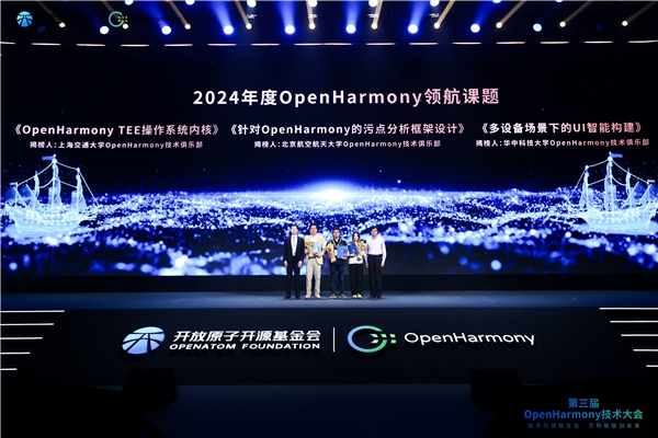 经由TSC成员、PMC成员、各TSG代表和高校技术俱乐部专家组成的领航课题评委组评选,本次大会还首次表彰了在技术创新和社区贡献方面有突出表现的3个领航课题,分别是上海交通大学《OpenHarmony TEE操作系统内核》、北京航空航天大学《针对OpenHarmony的污点分析框架设计》、华中科技大学《多设备场景下的UI智能构建》。