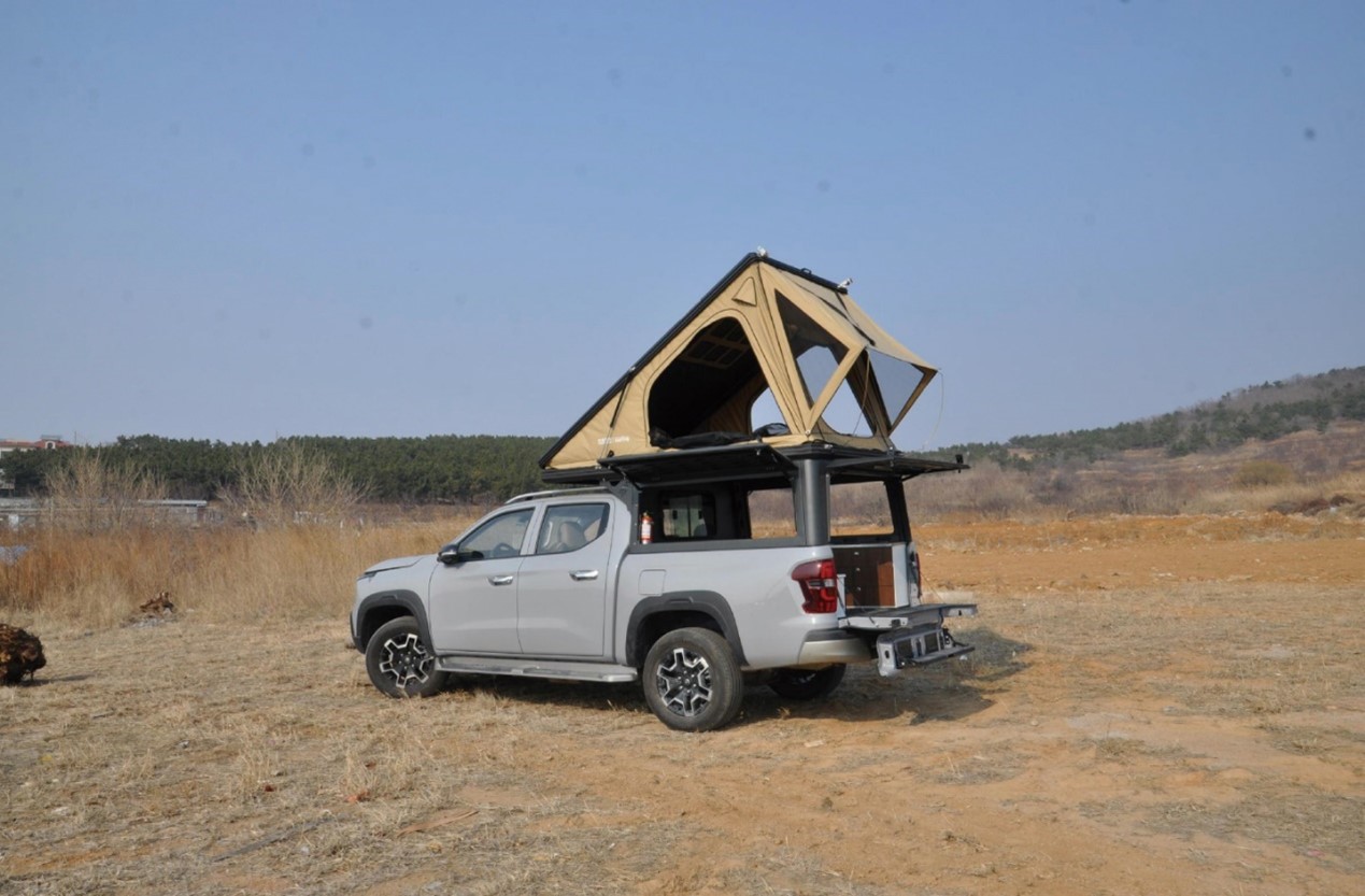 车顶帐篷展开后,其高度和长度都令人瞩目。长度达到2500mm的睡眠空间,确保了宿营者能够享受到宽敞舒适的睡眠环境,车厢内、外皆可自由出入帐篷,方便快捷,私密性好。而货箱内部空间同样充足,帐篷底部床边可以两侧打开,货箱内部最高可达2600mm,最大限度释放内部使用空间,配合储物柜实现坐下休息的功能。不仅标配高盖帐篷、灭火器、外置爬梯等实用设施,还有丰富的选配项目可供选择,如左右侧储物柜、折叠洗菜盆、清/灰水箱、电磁炉、便携马桶以及多功能插座面板带USB Type-C接口等,让宿营生活更加便捷多彩。选装两侧边柜不仅可用于物品收纳,还能充当座椅使用,一物多用,实用性极强。