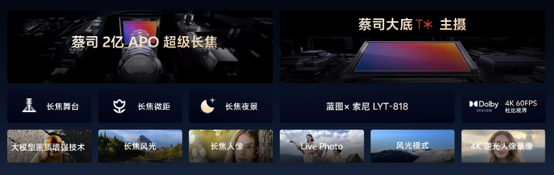 vivo通过常年深耕移动影像,推动自研技术积累,同时与供应链顶级合作伙伴广泛开展技术共研,成功打造出一代又一代的影像旗舰。作为vivo在2024年度倾力打造的新一代影像旗舰,vivo X200 Pro和vivo X200 Pro mini的蔡司大底T*主摄,配备vivo与索尼联合定义的全新主摄传感器蓝图x索尼LYT-818(1/1.28英寸),采用22nm制程工艺,搭载vivo自研VCS仿生光谱3.0技术,不仅实现了更优功耗,HDR规格也大幅提升,配合f/1.57光圈和具备精度跃迁技术的定制镜头,主摄拍照比肩1英寸,视频全面超越1英寸。主摄之外,长焦更强。vivo X200 Pro搭载Ultra同款蔡司2亿APO超级长焦,搭配蓝图影像算法大模型画质增强技术,20倍及以上细节表现显著提升,有效改善长焦高倍率ZOOM画质,实现大幅领先行业的长焦硬核实力。