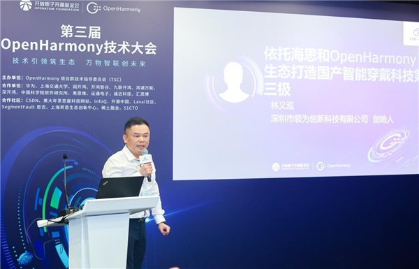 深圳市领为创新科技有限公司CEO林义巡以《依托OpenHarmony生态打造智能穿戴科技第三极》为主题发表演讲。他分享了领为创新科技在智能手表上的多年耕耘历程,也对比剖析了海思芯片和OpenHarmony的优势:开放、包容、互通互联、潜力无限;领为科技为更是为大会带来了多款基于海思W610+OpenHarmony的商用穿戴展品,他对OpenHarmony助力穿戴第三级品牌崛起有很强的信心。
