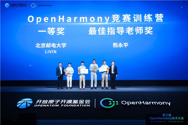 本届 OpenHarmony竞赛训练营聚焦产业需求和AI应用,希望开发者为行业注入新鲜活力,并且结合AI时代的大背景,探索“OpenHarmony+AI”应用先进能力。这不仅为学生们提供了更广阔的创新空间,也为OpenHarmony生态系统的拓展和完善注入了新的动力。竞赛训练营自启动以来,便吸引了众多高校的热切关注与积极参与。来自全国各大重点院校的学生们踊跃报名,涵盖了计算机科学、电子工程、通信技术等多个专业领域。今年来自84个赛队共220+学生报名参与,10月11日经过一天激烈的决赛角逐共有10个赛队脱颖而出。最终,上海交通大学的鸿智宇飞队获得OpenHarmony竞赛训练营特别创新奖;南开大学的拿奖公布蟹黄堡秘方、上海交通大学的古神yyds队、武汉大学的Lumos Solem、华中科技大学的阁下又该如何应队、武汉大学的从容应对、金陵科技学院的你也是个rapper等赛队获得OpenHarmony竞赛训练营三等奖;华中科技大学的加冰陈化、上海交通大学的鸿智宇飞队获得OpenHarmony竞赛训练营二等奖;北京邮电大学的LIVIN赛队获得OpenHarmony竞赛训练营一等奖,该赛队的指导老师熊永平老师荣获OpenHarmony竞赛训练营最佳指导老师奖。