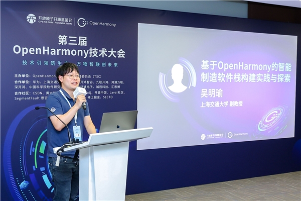 上海交通大学副教授吴明瑜,在分论坛上分享了“基于OpenHarmony的智能制造软件栈构建实践与探索”。吴明瑜阐述了OpenHarmony在智能制造领域的潜力,展示了其团队如何在OpenHarmony上构建软件化控制系统,实现控制逻辑的弹性部署和更新。他详细介绍了如何通过与云侧能力的整合,实现对制造现场的远程监控,以及这些研究成果如何在真实产线中部署,为智能制造系统提供经验和参考。