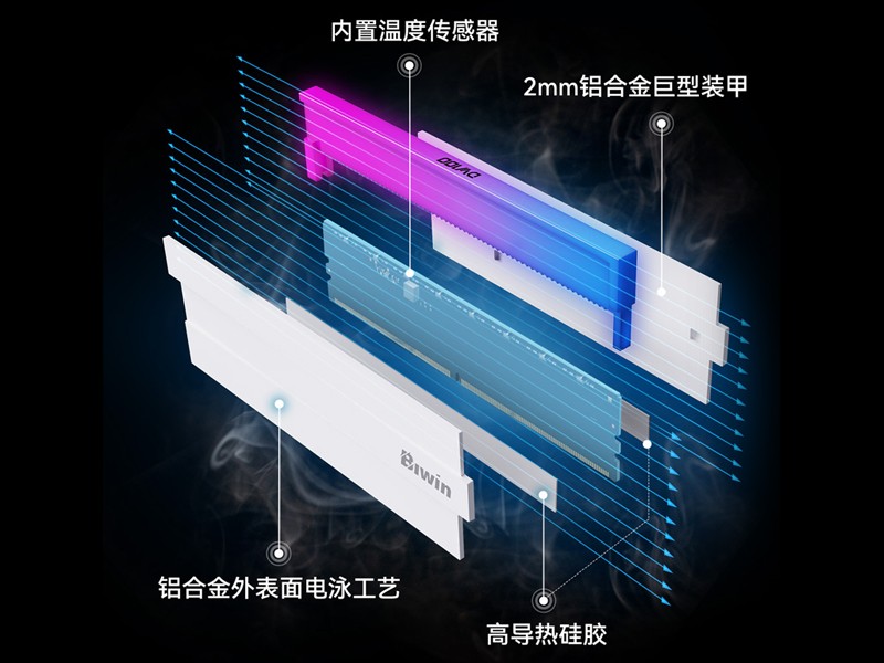 分层散热架构,包括2mm铝合金巨型装甲、导热硅胶和内置的温度传感器,控制热量传输环节数量,同时留出适当空隙,有利于空气流通带走热量。