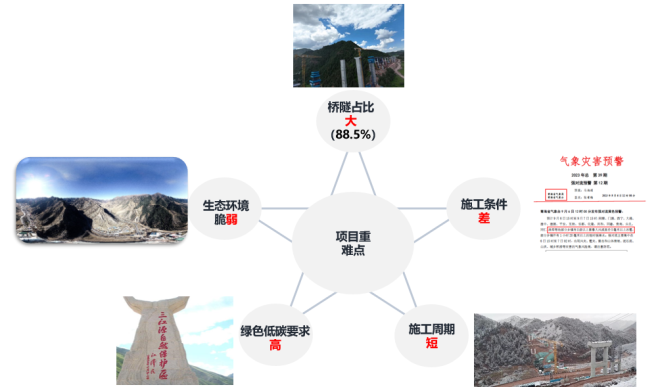 项目地处平均3500m的高海拔地区,具有桥隧占比大(88.5%)、生态环境脆弱、施工条件差、绿色低碳要求高、施工周期短等5大重难点。在建设初期,主要面临以下三方面问题: