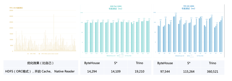 首先,ByteHouse湖仓一体关键能力之一在于“快”。在当今复杂的商业环境下,企业每天需要面临大量决策,而高效的数据反馈可以提升企业决策效率和准确度。从Native Reader、IO 优化、多级Cache、物化视图、优化器五个方面,ByteHouse针对性能进行了大量优化。例如,在并发支持和复杂模型处理上,ByteHouse则通过自研优化器等手段优化了ClickHouse的不足,在经典的星星、雪花负载模型下已得到验证。从数据效果上看,ByteHouse在SSB Flat 100G 、TPC-DS 100G 测试中的表现,基本高于行业同类型产品。